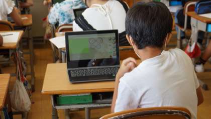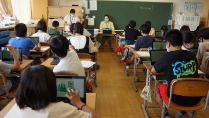 6年1組はタブレットでプログラミングを,2組は国語の学習を行っていました。
