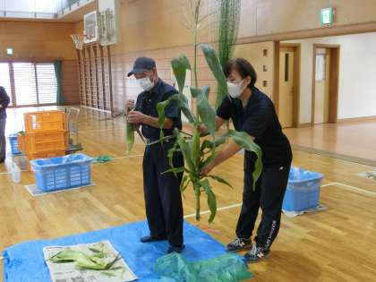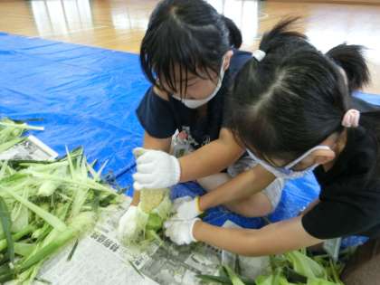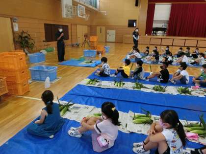 とうもろこし皮むき体験 公開日 2021/07/13 更新日 2021/07/13 校内行事 2年生が、体育館で「とうもろこし皮むき体験」を行いました。講師の砂川さんと永井さんに分かりやすく教えて頂きました。