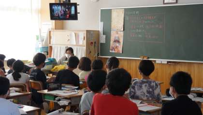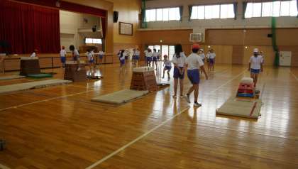 6年1組は体育館で跳び箱の練習をしていました。2組は社会でビデオを使って歴史の学習をしていました。