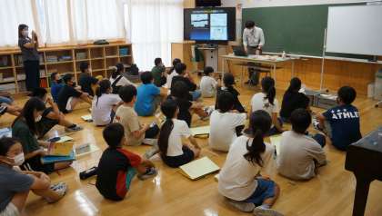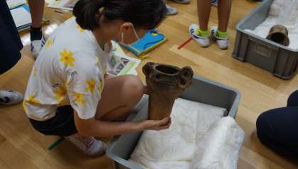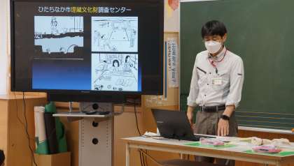 出前授業 公開日 2021/07/16 更新日 2021/07/16 校内行事 5,6時間目に、6年生が社会の出前授業を受けました。市埋蔵文化財調査センターの稲田先生から、虎塚古墳について,映像や実物の土器に触れながら学ぶことができました。