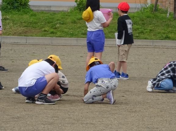運動会に向け、たてわり班でグラウンドの石拾いをしました。高学年が1年生の面倒をよく見ながらみんな熱心に石を拾っていました。