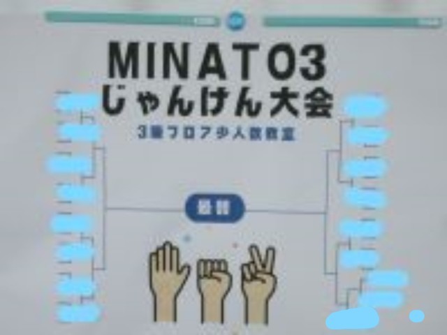 3階フロアーでは、5・6年生の希望者で「MINTO 03 じゃんけん大会」が行われています。エントリーした子どもたちで、トーナメン表に従い、じゃんけん大会を行っています。この大会は、最強と最弱を決める大会です。最強では、勝ち進んだ子が、最弱では、負け進んだ子が優勝となります。勝っても負けても、楽しく仲良く過ごす姿が微笑ましいです。