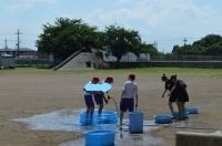 6年生の家庭科で「夏をすずしくさわやかに」という単元があります。子どもたちから、「涼しく過ごすために水遊びをしたい」といった意見が上がりました。その考えを尊重し、炎天下の中水遊びを行いました。担任や他の先生方も交えて水鉄砲で水を掛け合ったりホースで水を浴びたりし、グランドには大きな歓声があがっていました。