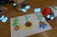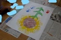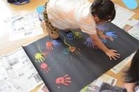 5,6年生が低学年の子どもたちの手のひらに絵の具を付けてあげるなど、よく面倒を見ていました。また、みんなで協力し合いながら、楽しく活動に取り組み、個性豊かな作品を仕上げていました。