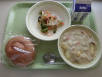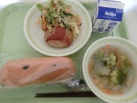 ★給食メニュー 和風スパゲッティ 牛乳 たらのあおさフライ チキンサラダ★クイズ...