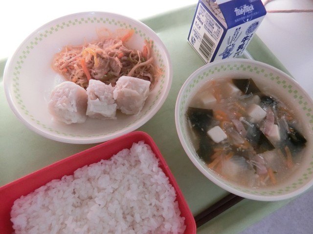 ごはん 牛乳 エビシューマイ 春雨のカラフル炒め わかめスープ