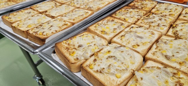 3連休明け、みなさんはリフレッシュできたでしょうか。子供たちは少し疲れた様子もありましたが、「給食を楽しみに来た」という子や献立表を見てガッツポーズをしている子もいました。給食室では、そんな期待にこたえるため、調理員さんも一生懸命に作ってくださいました。今日は給食室で手作りのトーストだったので、調理が大変でしたが頑張ってくださいました。具を作って1枚ずつ食パンに塗って焼き上げます。大量に作るので、具が足りなくならないように、計量して塗っています。子供たちも笑顔で食べている様子で、給食後も「完食しました」「トーストがおいしかった」「ゼリーが冷たくておいしかった」という声がありました。