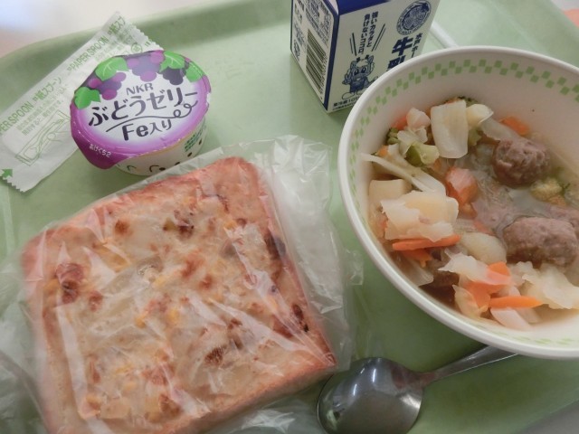 コーンマヨネーズトースト 牛乳 肉団子と野菜のスープ煮 ブドウゼリー