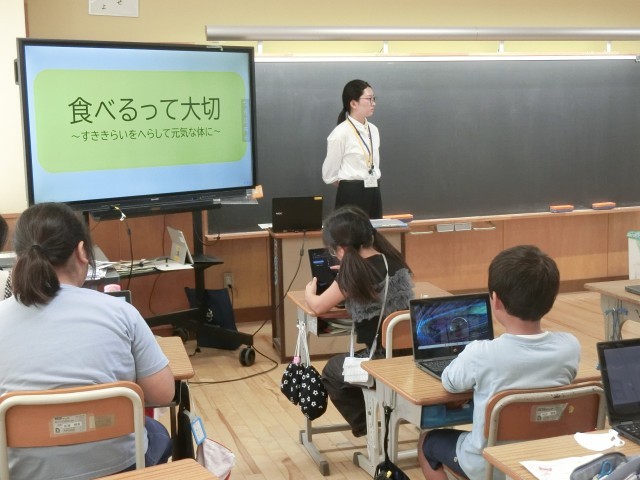 昨日と本日で3年生2クラスに食育の研究授業として「食べるって大切~すききらいを減らして元気な体に~」を行ってもらいました。本日は茨城キリスト教大学の指導教員の中村先生にご参観いただきました。アンケート結果から、苦手な食べものがある児童が約8割で、ピーマンやトマトなどの野菜、きのこ、魚などがあげられました。理由としては「味」が最多でした。今回は「苦手を減らすとどんなよいことがあるだろうか?」という課題をもとに、食べ物の3つのはたらき「赤・黄・緑」を理解し、苦手を克服するアイディアを考え、「苦手を減らすと健康な体になる」ということを学び、自分の食事のチャレンジ宣言をしました。子供たちからは「お父さんにもいつも食べるように言われているけれど、今日改めてわかった」「にんじんが苦手だけど、好きな肉と一緒に食べると食べられるかも」「苦手なものでも一口は食べてみる」などの話があがりました。授業後の給食では意欲的に食べている児童の姿がありました。ご家庭でも、無理強いしない程度に促す声かけをお願いいたします。お子さんへの効果的な声かけの仕方や考え方は、10月の食育だよりを参考にしてみてください。