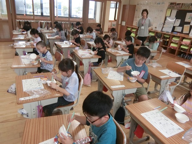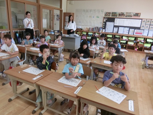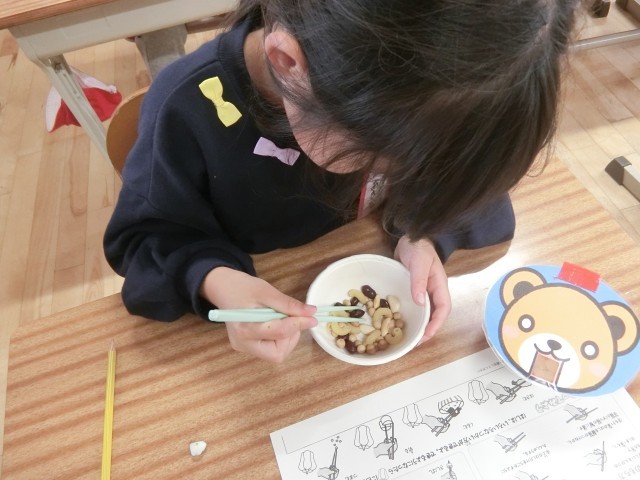 今週は栄養教諭と実習生が1年生2クラスに「お箸名人」の食育授業を行いました。それぞれ実際におはしを使って、豆、スポンジ、マカロニをつまみ、クマさんに食べさせてあげました。子供たちは夢中でやっていて、「やった!つまめたよ!」と笑顔で教えてくれる児童がたくさんいました。日頃に誤ったおはしの持ち方で持っている児童は、慣れない持ち方に疲れた様子でしたが、お箸名人になるためには練習あるのみです。おはしを正しく持てると、おいしくきれい食べることができます。また、やってはいけない箸使いなどの食事のマナーもあります。以下の動画を参考に、ご家庭でも、ぜひ正しいお箸の持ち方を気長にで構いませんので教えてあげてください。