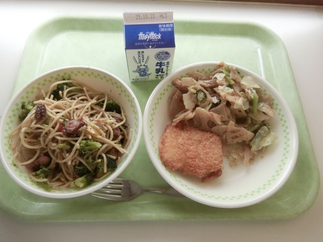 今日はひたちなか市で加工された「たこ」をジェノベーゼスパゲッティに使用しました。新メニューで、夏休みに市内の全校の調理員さんと栄養教諭等で試作検討行いました。ちなみに、ひたちなか市は全国で有数のたこの加工地です。那珂湊の水産加工会社では、多くのたこを加工して、全国へ出荷しています。今日のスパゲッティは、たこに合わせてパプリカで彩りよく、バジルとにんにくの香りで食欲をそそる一品になりました。献立全体でも、たこ、つくば鶏、れんこん、牛乳など地場産物を豊富に使用した献立になりました。子供たちは「いい香り」「おいしかった」「高級イタリアンみたいですね」と好評でした。一方で「たこの見た目が苦手」「たこの吸盤が苦手」「れんこんの食感が苦手」という子もやや見られました。