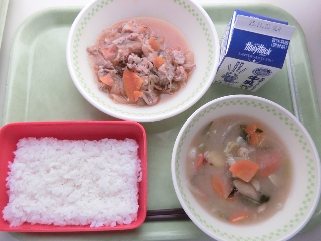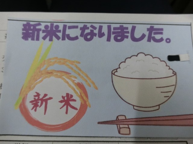 委託している炊飯会社さんから「新米」のお知らせが届きました。今日から新米だそうです。一般的に新米がとれる時期はもう少し早いのですが、学校給食の場合は在庫のお米を使い切ってからでないと新米は出せないので、少し時期に差があります。今日は新米で豚丼を味わいました。やはり、新米はつやつやでみずみずしく、甘味があり、おいしさが格別でした。子供たちも「おいしい」とごはんと一緒に豚丼の具を味わっていました。
