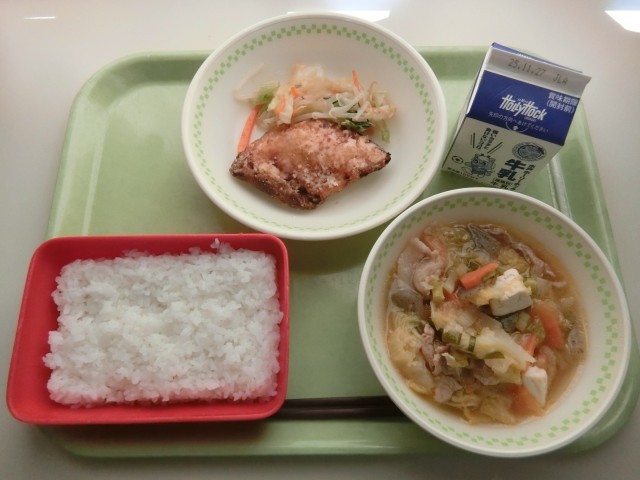 ごはん 牛乳 ほっけの竜田揚げ キャベツと小松菜のあえ物 豚汁