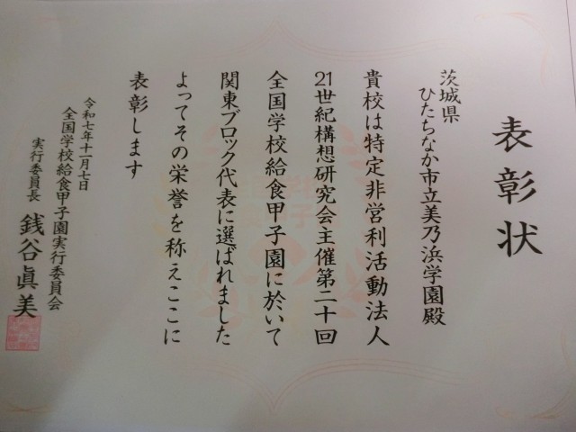今日は県が定めた「茨城美味しおDay」(毎月20日)ということで、県内のすべての学校給食実施校で減塩献立が提供されています。日頃より、子供たちの健康を考えて減塩を意識した献立なのですが、今日はさらにこだわった献立になっています。さらに、今年度行われている「第20回全国学校給食甲子園」で「関東代表」に選抜されたメニューも減塩にちなんだ献立ということでタイアップして提供しました。残念ながら決勝大会には進むことができませんでしたが、本校の給食を関東代表に選んでいただけたことは光栄なことです。ありがとうございます。れんこん、しらすぼし、さつまいも、ピーマンなど全国に誇る茨城の食材をふんだんに使った減塩献立を全校でおいしく味わいました。本日は学校運営協議会の委員の皆様にもご試食いただきました。ありがとうございました。