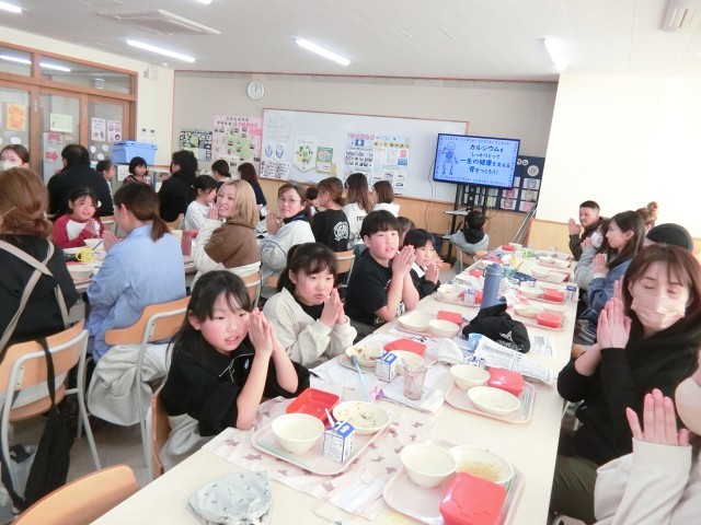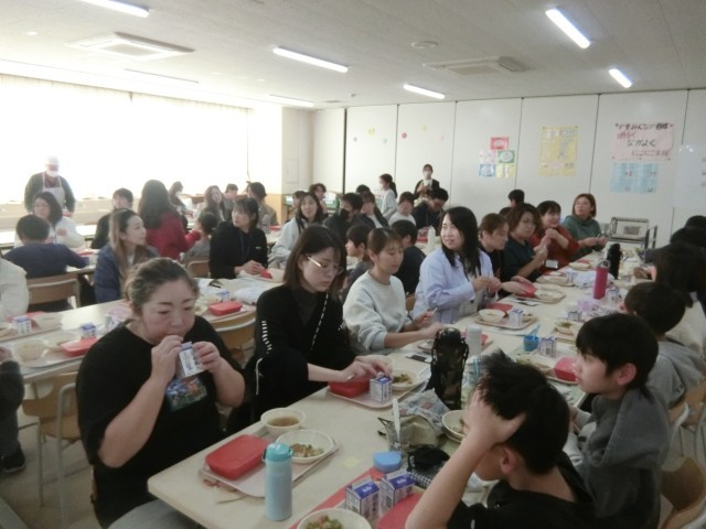第3学年の親子給食が行われ、親子で楽しく給食を味わっていました。今日が誕生日の児童がいたので、盛大にみんなで牛乳乾杯!でお祝いをしました。お家の方と学校で食べる給食。いつもは苦手な食べものだから、と食べ残している子もお家の人の前だからと頑張って食べている子も見られました。保護者の方からは「ごまあえがおいしかった」「家でも作ってみたい」という声がたくさんありました。栄養教諭からは、献立の説明とカルシウムの摂取量についてお話をさせていただきました。お忙しい中、ご参加いただきありがとうございました。