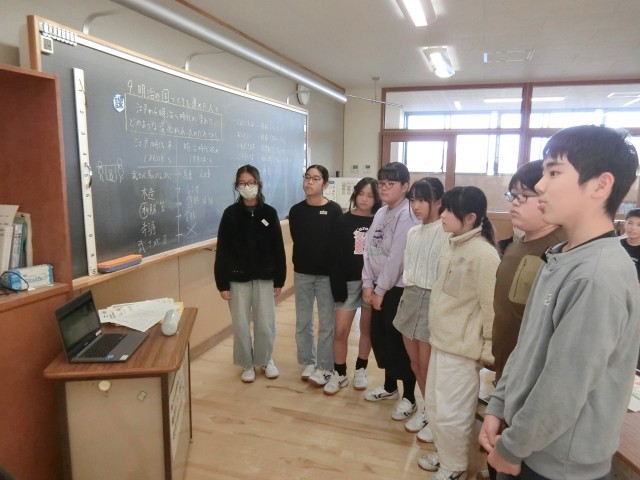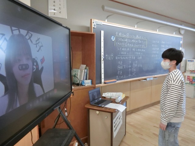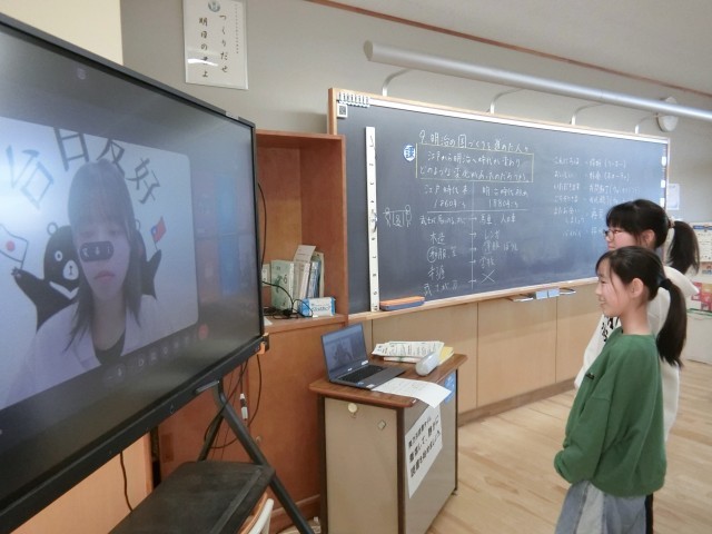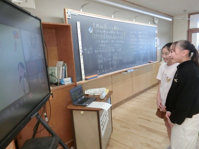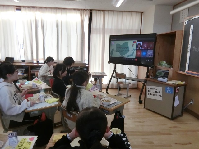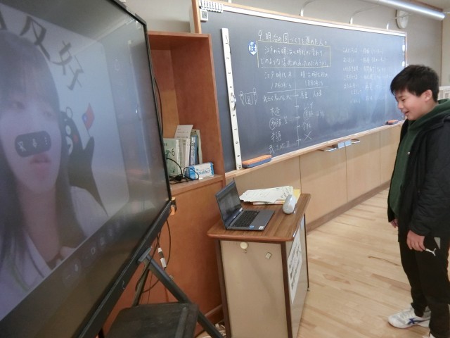 給食時間から昼休みにかけて、第6学年の児童が台湾の給食委託会社「統鮮美食股份有限公司」の蔡(サイ)栄養士さんとオンラインで給食交流を行いました。調理員さんにもご協力いただき、台湾から提供された「台湾風塩味揚げ野菜」のレシピをもとに調理していただきました。でんぷんをまぶして油で揚げた野菜類に塩コショウで味付けしたものです。子供たちからは「れんこんがシャキシャキでおいしかった」「さつまいもが甘くてもっと食べたかった」など好評でした。この取組は、「大享食育享曾(台湾の食育協会)」の企画・協力があって実現したものです。今日のために、事前に台湾の言葉を学習し、熱心に昨夜に自主学習で勉強してきた子もいました。11月7日には同学年2組の児童が台湾の小学生との交流を行ったので、今回は1組で行いました。児童から「台湾の給食はどのようなものですか?」「台湾で人気の給食や食べ物は何ですか?」「台湾の給食でよくでる魚は何ですか?」「台湾のパワースポットは何ですか?」など質問をさせていただきました。「ルーローハン」や「タピオカミルクティー」など、日本でもお馴染みの台湾の料理をご紹介いただき、児童は「食べたい~」と声を漏らしていました。日本の給食とは違い、台湾では「果物は丸ごと提供されること」や、「加工された菓子類のデザートは出ないこと」「魚はサメやナマズがよく出ること」「日本でよく食べる『さば』は高級魚として扱われること」など、子供たちは文化の違いに驚いていました。しかし、日本と同様、台湾の子供たちも「カレーや揚げ物が好き」など、共通点もあることがわかると、共感して喜んでいました。また、台湾の方から日本のパワースポットを聞かれると、子供たちは「ひたち海浜公園のネモフィラ」「ほしいも神社」などと答えていました。