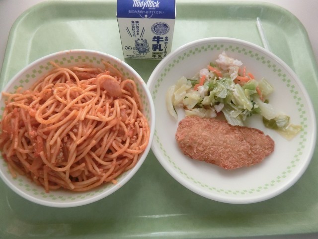 ミートソーススパゲッティ 牛乳 あじフライ レモンドレッシングサラダ