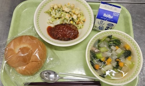ミルクパン 牛乳 ハンバーグトマトオニオンソース ク〇〇ンサラダ マセドアンスープ