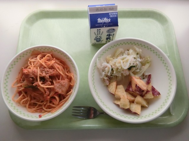 ベーコンのトマトスパゲッティ 牛乳 水菜とツナのサラダ シュガーさつまいも