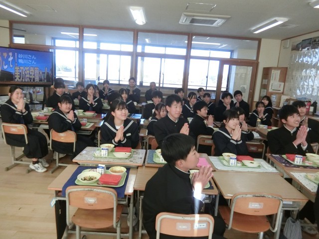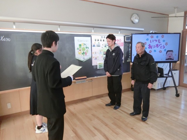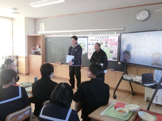 1月24日から30日は国が定めた「全国学校給食週間」です。給食の歴史を振り返り、給食や食材などに感謝をするなどの機会としています。本校では、これにちなんで、本日はルーから手作りの昭和の黄色い「昔のカレー」を提供し、給食時間に給食食材生産者(稲田地区のにんじん農家:砂川さん、柳沢地区のたまねぎ農家:鴨川さん)をお招きする招待給食を実施し、7年2組の教室で実施しました(他の学級も食育動画を視聴しました)。子供たち・生産者とも少し緊張した様子でしたが、楽しく、おいしく、感謝の気持ちで給食を食べることができました。いつもは給食を残しがちな生徒も、今日は自ら少し頑張って食べている様子が見られました。会食の最後には、各学級の代表と給食委員会の児童生徒が作成した感謝のメッセージを手渡すことができました。ひたちなか市報の取材もあり、2月号に掲載予定となっています。今回は「食と農業」の特集ということで、学校給食がその紙面の一部として掲載されるそうです。詳細は後ほどお知らせします。楽しみにしていてください。