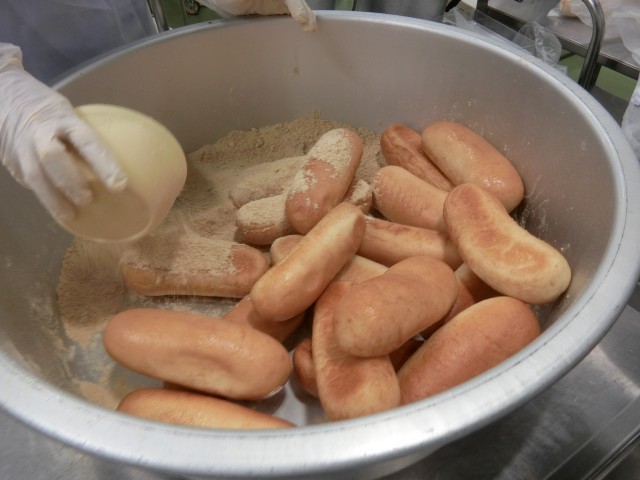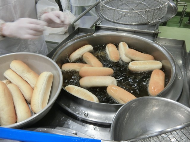 給食週間2日目です。子供たちは朝から献立表を見て、揚げパンやワンタンスープを楽しみにしていた様子でした。揚げパンは給食室で手作りしています。施設によっては揚げパンは手間がかかるので提供できないこともありますが、ひたちなか市では提供しています。朝、パン屋さんがコッペパンを届けてくださり、給食室で油で揚げます。この油もこだわりがあり、古い油では油についた匂いや味がパンに付着してしまうので、新しい油で揚げています。揚げ時間は数分で、パンは軽く浮いてしまうのでおもりで抑えて揚げます。揚げたパンは味が付くように熱いうちに、きなこと砂糖をまんべんなくまぶします。