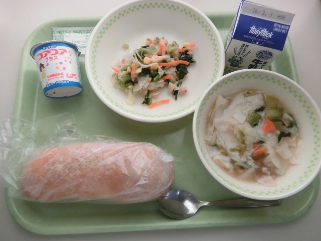 給食中、子供たちは口や服をきなこだらけにして、おいしそうに食べていました。袋に残ったきなこは、ヨーグルトや牛乳に入れて食べている様子もありました。