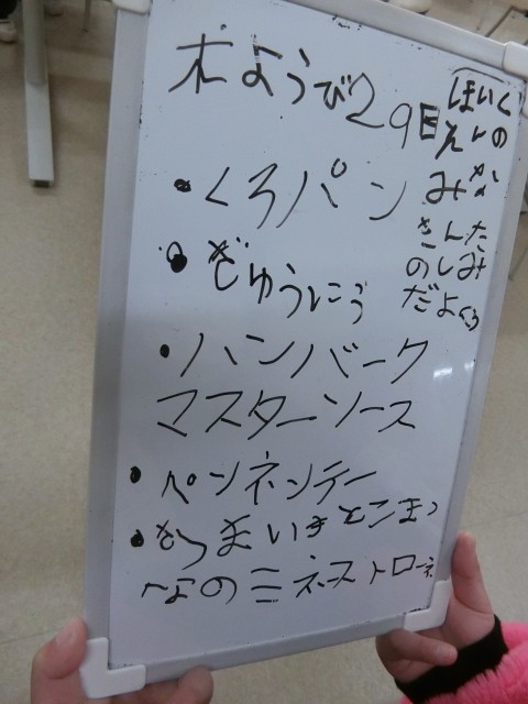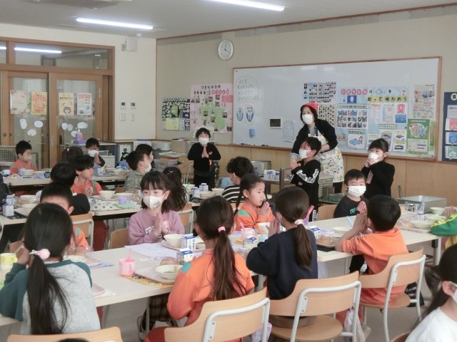平磯保育園の園児のみなさんと1年生がランチルームで交流給食を行いました。1年生は交流をとても楽しみにしていた様子で、児童が献立の読み上げ用に書く献立ボードにもその気持ちが書いてありました。1年生は園児たちに、ストローのさし方や給食の片付け方を教えるなど、立派なお兄さん・お姉さんでした。楽しそうにおいしく食べている様子があり、給食後は楽しそうに中庭で一緒に遊んでいました。