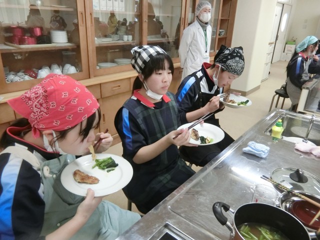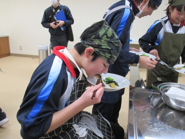 副菜の「小松菜の煮びたし」を添えて、自分たちで作り上げた一皿を実食しました。