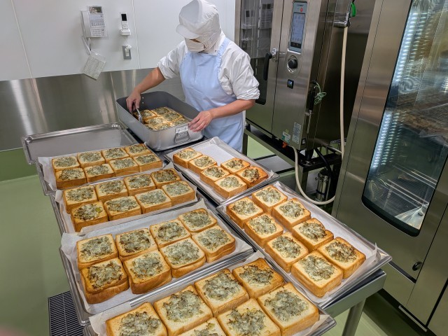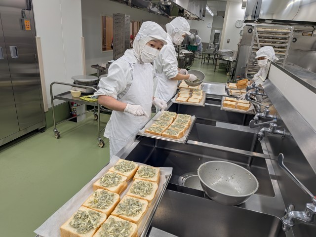 今日は給食室で手作りのトーストでした。パン屋さんから食パンを購入して、具を作って1枚ずつ載せて焼き上げます。ひたちなか市の学校給食では、ピザトースト、フレンチトースト、コーンマヨネーズトースト、スイートポテトトーストなど様々なトーストがあるのですが、今日は新しく「しらす」を取り入れたトーストを提供しました。細かく刻んだたまねぎ・パセリ・にんにくとしらす、オリーブオイル、こしょう、チーズを混ぜ合わせて具を作ります。しらすが苦手な子もいたようですが、「食べやすい」「たまねぎの食感がよい」などと好評でした。