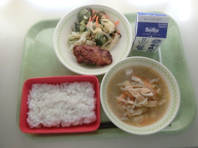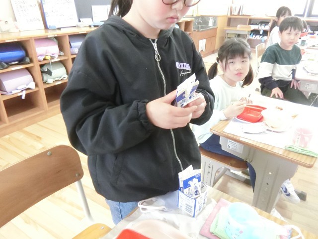 いよいよ今年度の給食が始まりました。春休み期間中、給食が恋しかった子や職員がたくさんいたようで「野菜不足で元気が出なかった」「口内炎ができた」という声もありました。食べ残りも少なく、おいしく食べてくれたようです。また、今年度からゴミ袋使用削減のため、飲み終えた牛乳パックは箱を作って複数おりたたんで入れる方式にしました。早速、4枚使っていたゴミ袋を2枚削減することができました。コロナ禍でこの方式は中止していたことから、低学年は初めてのことだったので、誰が箱を作るかなど子どもらしく盛り上がっていたようでした。給食室では調理員さんも人事異動があり、新体制で慌ただしいなかで安全な給食提供のために、細心の注意を払って調理してくださっていました。