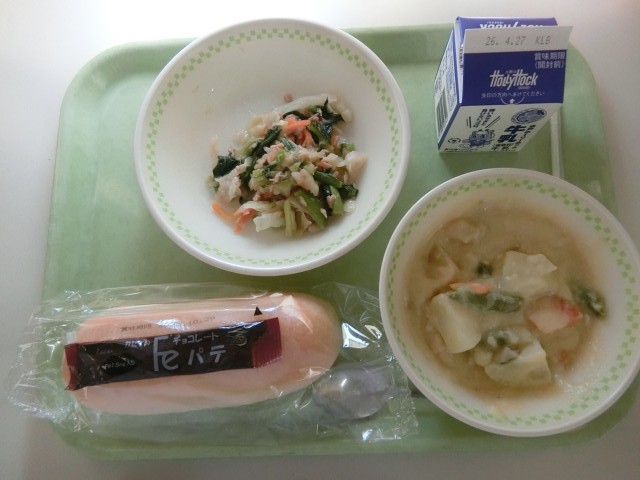 コッペパン チョコクリーム 牛乳 アスパラガスのシチュー オニオンドレッシングサラダ
