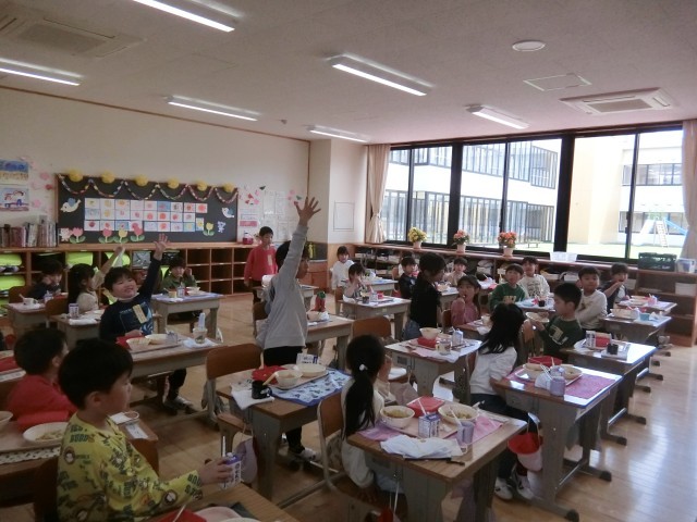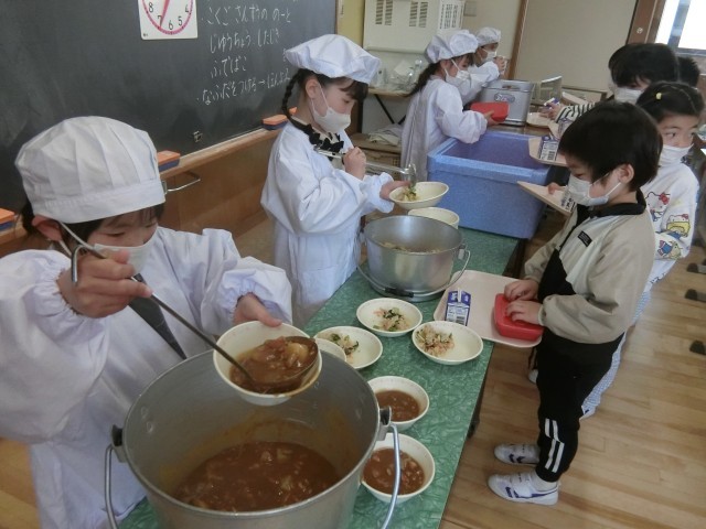 給食のカレーは子供たちに大人気。もちろん、先生たちもです。カレーは作るのは簡単でしょ?と思う方もいらっしゃると思いますが、大量のじゃがいもの芽とりやたまねぎの茎切りなどは手作業でしかできないため、意外と大変な料理です。調理でも調理員さんが大量の野菜を力いっぱい混ぜて炒めていました。カレー作りの翌日は腱鞘炎になるそうです。1年生は給食3日目、カレーもこぼさずに上手に盛り付けていました。口元や服をカレーだらけにして「おいしい!」「いい匂い!」と喜んで食べていました。他の学年も美味しく食べてくれていました。