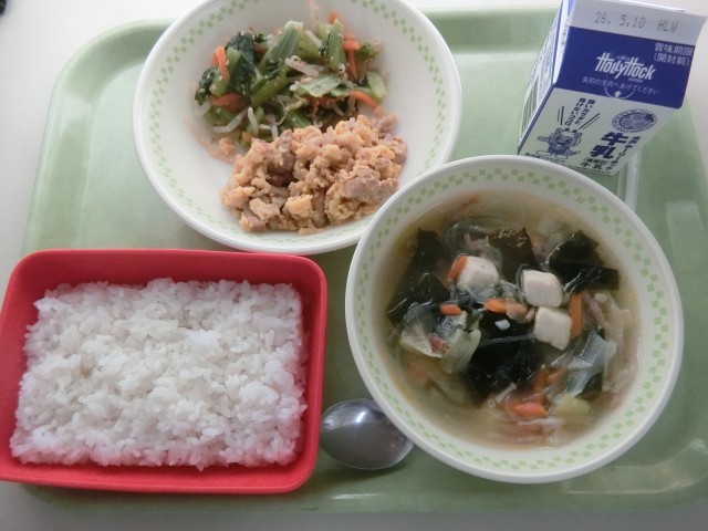 韓国料理のビビンバでした。中華料理と思っていたという子もいましたが、韓国の料理です。韓国の言葉で「ビビン=混ぜる、バ=ごはん」という意味があり、韓国の混ぜごはんのことです。ごはんにおかずをのせて、混ぜて食べていました。なかには混ぜないで別々に食べたいという子もいました。今日は白ごはんの残りが少し減りました。ビビンバ効果です。