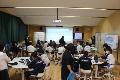 今日は2年生と7年生の学級でお客様をお迎えしての音楽の授業研究会を行いました。2年生では、繰り返しのリズムを考えてのお祭りの音楽づくりを、7年生では、遊園地などの表したいイメージをもとにして二部形式の曲づくりを行いました。どちらもChromebookを活用しました。参観した先生方からは、児童生徒が楽しんで学習に取り組んでいてとお褒めの言葉をいただきました。