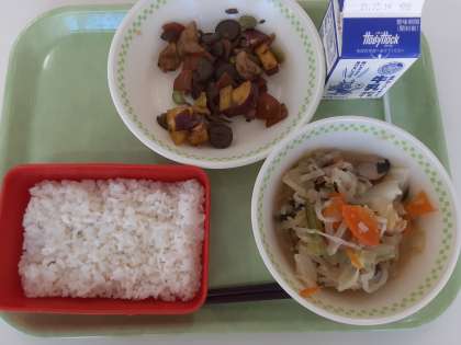 今日は「切り干し大根」「ごぼう」「さつまいも」など野菜たっぷりで,かみごたえのある食材を使ったメニューでした。根菜チキンは,さつまいもの角切りと鶏肉に片栗粉を付けて油で揚げて,ごぼう・にんじん・枝豆を炒めてしょうゆ・砂糖で甘辛く味をつけて,揚げた食材にからめて作ります。
