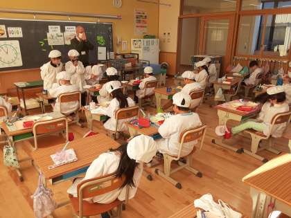 給食時間には「かむのが疲れた」という子もいました。現代はよくかまなくても食べられる料理が増えているため、咀嚼力が低下している子が多いです。写真は1年2組の給食の様子です。ちなみに,ごぼうを食べるのは日本の独特の食文化だそうです。外国の人たちは「なんで植物の根っこを食べるの?」と思うらしいです。