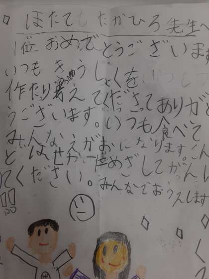 児童から,給食甲子園に関して,うれしいお祝いのお手紙をいただきました。聞くと,「書きたかったんだ」と自主的に書いてくれたそうです。ありがとうございました。