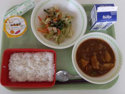 子供たちに同じ質問をすると「さつまいも」「ほしいも」「バインベリー」「魚」という答えが返ってきました。そのなかで、今日は地元のほしいもを使った料理「ほしいも入りカレー」にしてみました。子供たちは気がつかないで食べた人、恐る恐る食べた人、首をかしげた人、様々いたようです。「カレーにほしいも?」と思う方もいるかもしれませんが、これが合うんです。スパイシーなカレーの風味にほしいもの甘みがアクセントになって、まろやかな味わいが楽しめます。実は市販のレトルト製品でも売られています。ぜひ、ご家庭でもお試しください。余って固くなってしまったほしいもがありませんか?なお、炒めてしまうと溶けてしまうので、仕上げに入れる位でちょうどよいです。