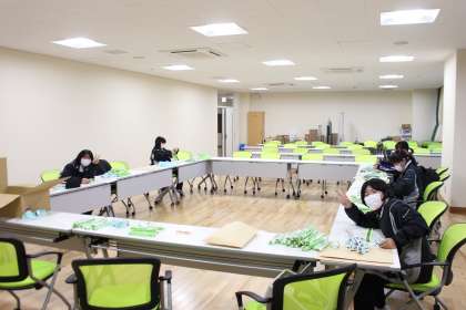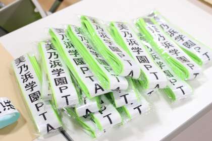 早速、到着したタスキに美乃浜学園のステッカーを貼る作業を後期課程の生徒がお手伝いしています。進んで仕事に取り組める気持ち、大切にしたいです。