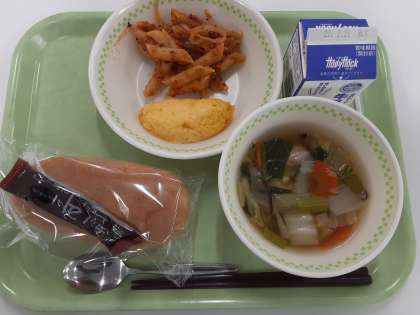 コッペパン チョコペースト 牛乳 オムレツ ペンネトマトソース 肉団子スープ