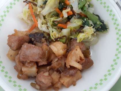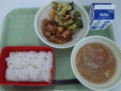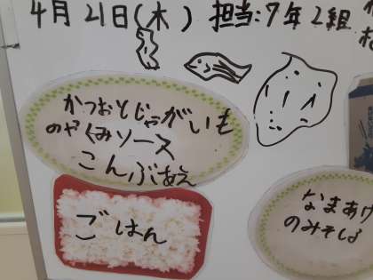 今日は今が旬の「かつお」と「じゃがいも」を角切りにして片栗粉をまぶし、油で揚げて、ねぎと甘酸っぱい味付けのタレをからめた料理にしました。「えっ?お肉じゃないの?」とだまされて食べてくれた子が多かったです。食べ残りも少なかったです。レシピは来週配付予定の5月献立表に掲載しますので、ぜひお試しください。