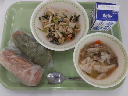 2色揚げパン(抹茶・きなこ) 牛乳 ツナサラダ ワンタンスープ