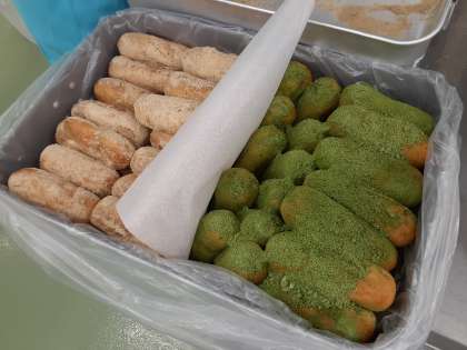 これにちなんで、給食も抹茶ときなこをそれぞれまぶした揚げパンにしました。作る手間はかかりますが、人気メニューです。ちなみに、抹茶は緑茶を粉砕したものです。子どもたちは初めての味だったようで、楽しみにしていました。この影響か休みの子も少なかったです。抹茶は好みが分かれたようでしたが、味わって食べていました。