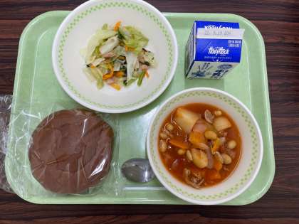 ココアパン 牛乳 ポークビーンズ オニオンドレッシングサラダ