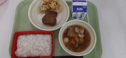 ごはん 牛乳 お月見ハンバーグ コーンサラダ だんご汁