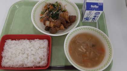 給食時間には9年2組で栄養教諭が栄養指導を行いました。指導後は「疲れているから、かつおや小松菜を食べて鉄をとろう」と意識している生徒の様子が見られました。