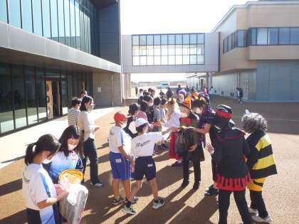 学校の近くにある複合型施設「いくり苑」の皆様が素敵な仮装をしていらっしゃいました。コロナ禍でなかなか交流の機会をもつことができませんでしたが、今回、エントランスではありましたが、ささやかな交流をすることができました。福祉委員会の児童生徒が代表して全校児童生徒分のお菓子をいただきました。「ハッピーハロウィン!」と声をかけ、お互いにとても素敵な笑顔でした。「いくり苑のおじいさん、おばあさんはとても優しいんだよ。」と教えてくれる児童も。これからいろいろな交流の機会がもてるといいと思っています。