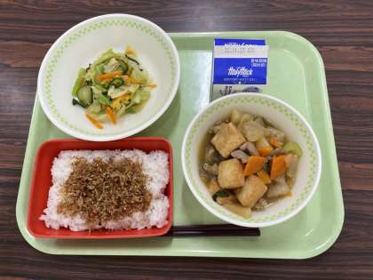 ごはん 牛乳 大根と厚揚げの炒め煮 手作りふりかけ しょうがあえ