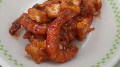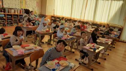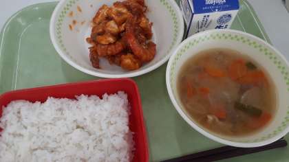 今日は先日の子供たちへの無償提供の高級車エビがまだ残っていましたので、「エビチリ」にして提供しました。「おいしい!」「ごはんが進む」とおおむね好評でした。「円卓が回転する高級な中華のお店で食べているみたい」と話していました。掲載写真は給食時間の2年1組の様子です。感謝の気持ちでおいしくいただきました。