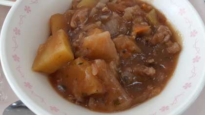 今日は今が旬のおいしい野菜がたっぷり入った茶色いシチューで「根菜ブラウンシチュー」と言います。私たちが食べている野菜は、種類によって「実、根、葉、茎など食べている部分が違います。根菜は、さつまいも、にんじんの他に、だいこん、ごぼうなどがあります。探しながら味わって食べていました。調理員さんも大量の根菜を洗って切って炒めてと、一生懸命に作ってくださっていました。
